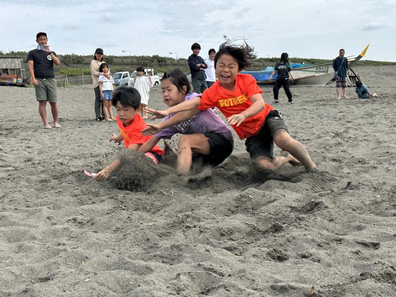 毎年恒例の地引網を、本日開催してきました。 イベントとして、 ビーチフラッグ おかし食べ競走 パラシュートキャッチ 等のイベントをしてきました。 ポットレーロFCでは、サッカーの他遊びも全力投球です。